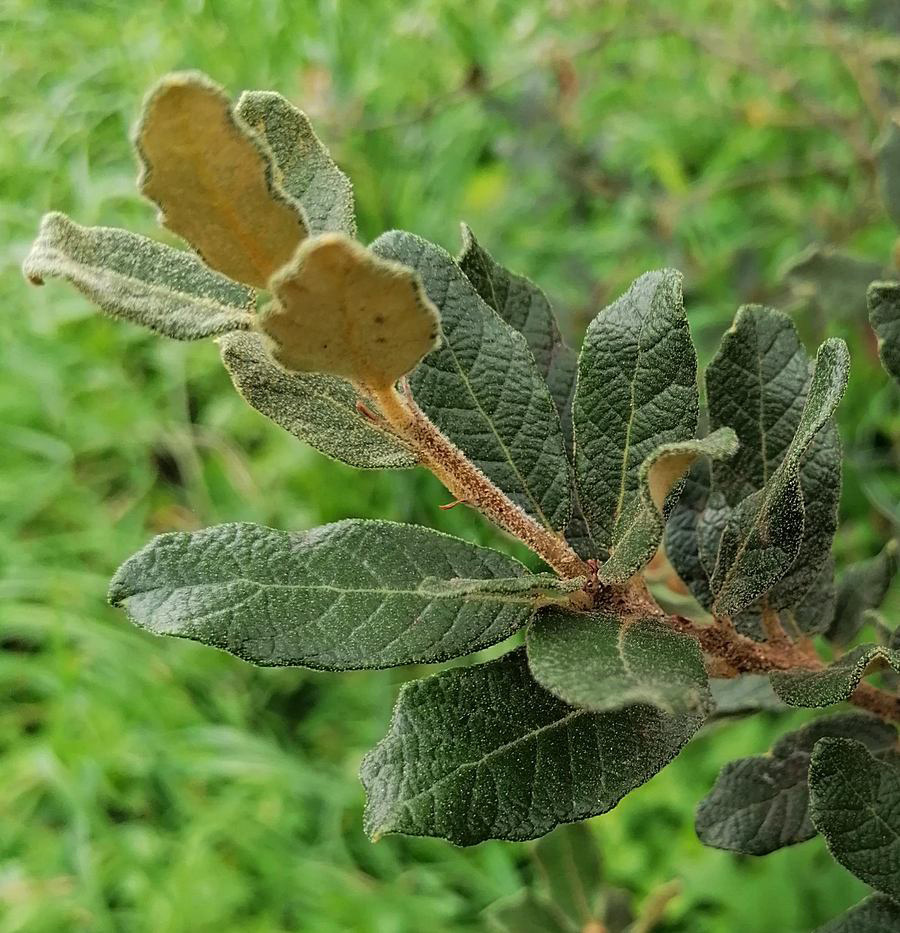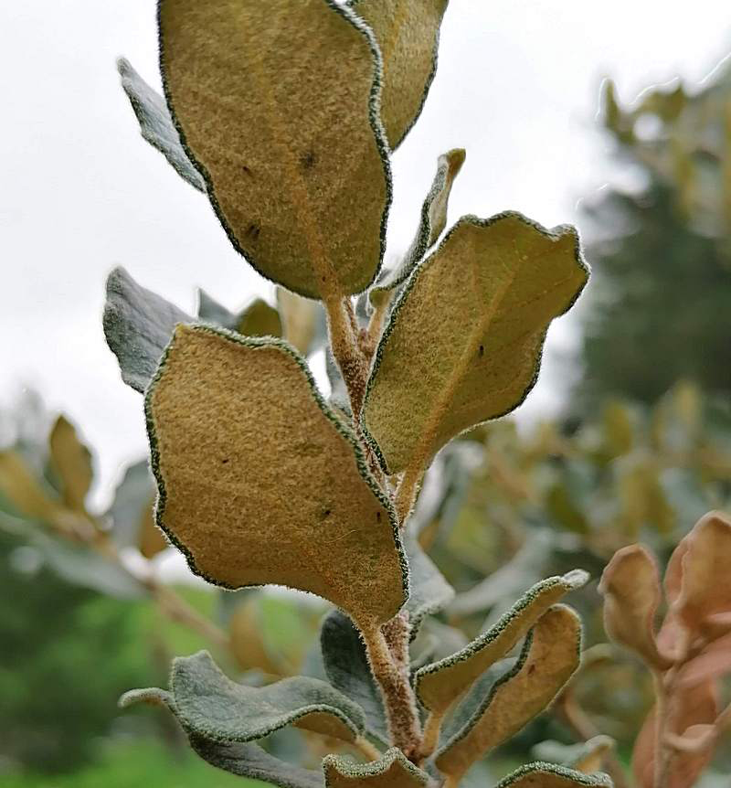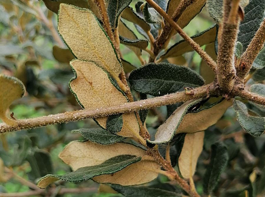 Leaves | 3-4 cm long, 1-2 cm wide; evergreen; broadly elliptic; both ends rounded; dark green, bright, subglabrous above; densely brownish tomentose below; margin crispate and revolute, wavy, entire or toothed; about 6 veins pairs, remotely curved, impressed adaxially, strongly raised beneath; petiole tomentose, 2-5 mm long; |