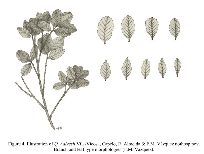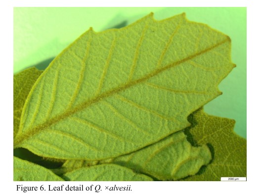 Leaves | 1.2-2.4 cm x 0.6-1.7: ovate, obovate or lanceolate; margin entire in the basal third (as in Q. lusitanica), serrate to denticulate in the apical 2/3, with blunt mucros; adaxially glabrescent, with stellate, multi-stellate and simple trichomes; abaxially tomentose, with trichomes as adaxially with more radiate and fasciculate ones; secondary veins biforked near base, at an angle of 45° with midrib; petiole 2-7 mm long, pubescent. |