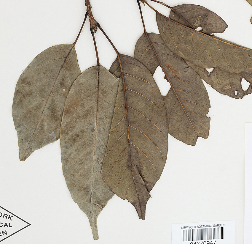 Leaves | 10-20 cm long, 3-8 cm wide; leathery; elliptic, oblong, lanceolate or oblanceolate; slightly glaucous, glabrous and bright above; dull below with dense silvery stellate tomentum, glabrescent; margin entire, revolute; apex sharply acute or acuminate; base attenuate, rounded or acute, slightly asymmetrical; 10-17 pairs of secondary veins, parallel, impressed above, strongly raised beneath, at 50-75° angled with the midrib; thin, sulcate, glabrous, 1-4 cm long petiole; |