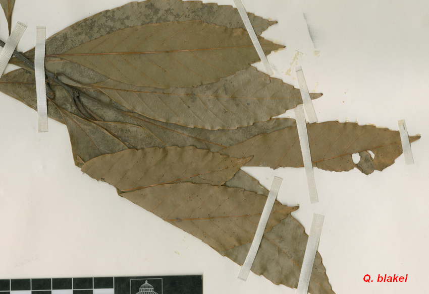 -- The specimens from China have been isolated as true species by Hickel & A. Camus under name Q. chrysocalyx (opinion shared with Govaerts & Frodin), but are actually conspecific with Q.blakei; -- The plants from Hainan have small leaves, and have