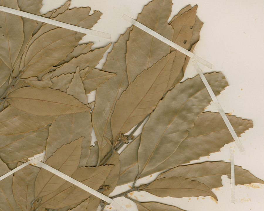 8-12 cm x 2.8-3.5; coriaceous; lanceolate; base attenuate; apex acuminate; hairless both sides when adult; adaxially smooth, green; beneath whitish, somewhat waxy; margin not undulate, serrate in apical 1/3, with short, hard teeth; midrib slightly raised adaxially, prominent beneath; 8-13 vein pairs, not evident above, prominent beneath, at an angle of 35° from the midrib; petiole 0.9-1.8 cm long, at first yellowish tomentose, then glabrescent; |