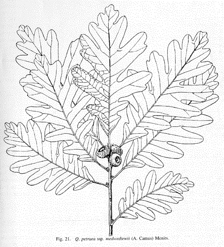 Leaves | 6-15 cm long, 4-10 cm wide; resembles Q.petraea, but leaves are thinner, obovate, , more lobed (3-6 pairs of narrow, irregular, subacute lobes, the lobe at the middle being often lobulate), base rounded or cordate; hairless above, slightly pubescent beneath (less than in Q.pubescens); petiole glabrescent 1.5-3 cm; |