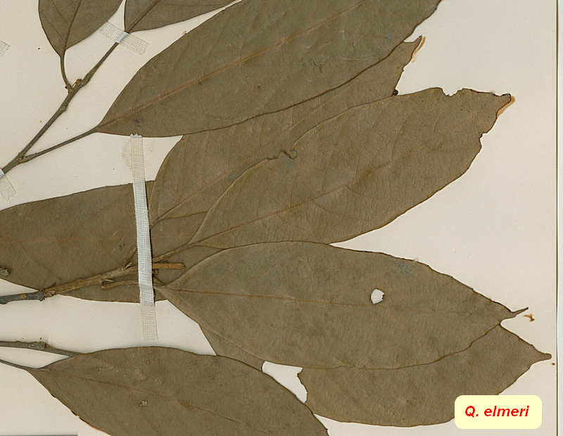 -- A. Camus : tome 1, p. 194, n° 8; -- Sub-genus Cerris, Section Cyclobalanopsis; -- Section Semiserrata, sub-section Semiserratae (Menitsky). -- Named after A.D.E. Elmer, 1870–1942, plant collector in Borneo and the Philippines |