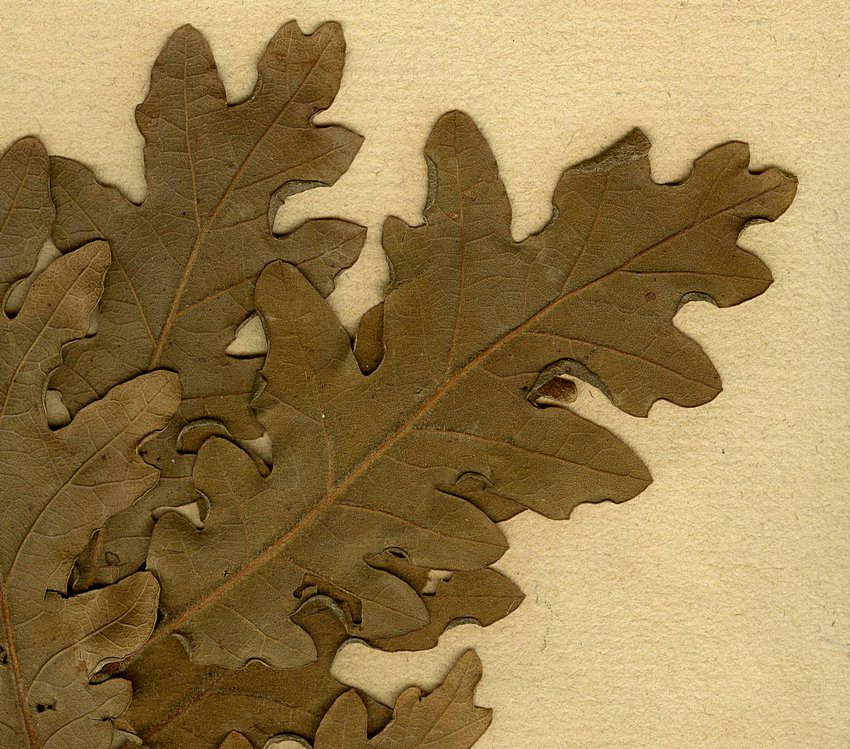 Leaves | 5-7 x 3.55 cm, semi-evergreen, leathery, elliptic-obovate; dark, glabrescent above, with stellate pubescence when young; densely tomentose beneath, especially along midrib (same types of hairs as in Q. pubescens, plus stipitate fasciculate trichomes); lobes irregular, simple, obtuse; apex acute; base cordate, slightly asymmetrical; 5-6 vein pairs, with sinusal veins; tertiary veins evident; petiole 0.5-,51 cm, tomentose; |