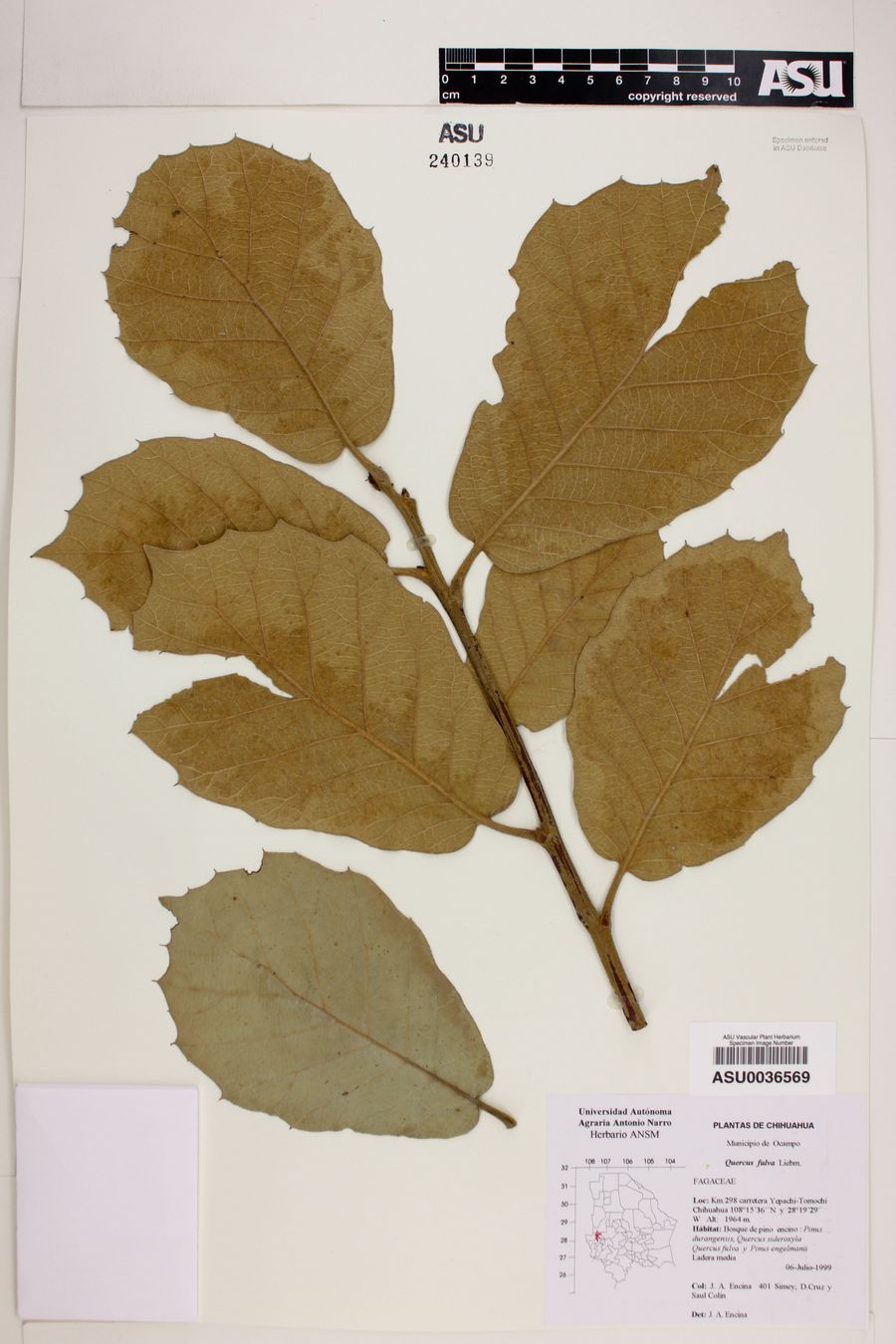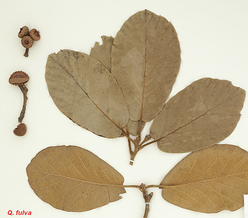 A. Camus : n° 303; -- Sub-genus Quercus, section Lobatae, Series Erythromexicanae; -- Can be confused with Q. crassifolia, but crassifolia has stalked trichomes abaxially, and numerous glandular, golden trichomes -- Resembles as well Q. calophylla, which differs in having longer multiradiate hairs below (0,55 mm), no other type of non glandular trichomes below, the margin toothed, the rim of the acorn straight, the limb flat. |