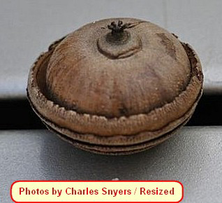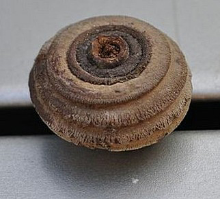 short, thick stalk; enclosed 3/4 by cup; cup 3-4 cm in diameter, flattened,