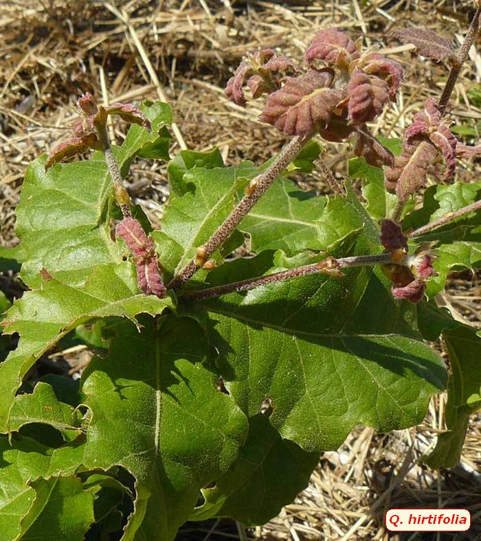 2,8-12 x 1,6-7 cm; coriaceous or subcoriaceous; oboval to elliptic, rarely ovate; 1.5-2 times longer than wide ; apex aristate, pointed or apiculate, occasionally rounded; base cordate, sometimes rounded to oblique; margin sinuate, with 2-6(-10) pairs of aristate teeth on the distal half and sometimes near the base, seldom only aristate (without teeth); young leaves reddish with stellate trichomes adaxially; mature leaves slightly pubescent above, with some stellate trichomes along midvein; persistent pubescence underneath with glandular and non-glandular trichomes; the latter made of fascicled hairs (the 8-12 rays spreading away from the axis of the trichome, giving an arachnoid appearance), the indumentum persistent or falling into plates by aging; abaxial epidermis usually smooth, sometimes slightly bullate; 6-12 pairs of secondary veins, raised under; petiole 2.5-8 cm long, at first densely pubescent, becoming glabrescent with sessile non glandular stellate hairs; |