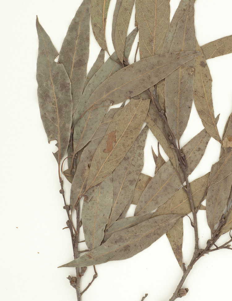 Leaves | 5-12 cm x 1-4; evergreen; thick, stiff; elliptic, lanceolate or narrowly oval; apex pointed and acuminate, bristle-tipped; base cuneate or attenuate; margin revolute, entire or with some bristle-tipped teeth in apical 1/2; shiny, hairless adaxially, except some hairs along midrib; paler beneath, with axillary tufts; epidermis not bullate; 10-14 vein pairs strongly prominent beneath, moderately prominent adaxially; petiole 5-20 mm long, glabrescent. |