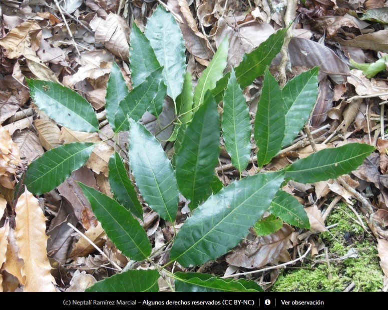 8-16 x 2.8-5 cm; subcoriaceous; lanceolate to narrowly elliptic, sometimes oblong, often asymmetrical at base; apex acute to acuminate, bristle-tipped; base cuneate or truncate; margin flat, with 7-11 pairs of aristate teeth; adaxially lustrous, hairless; abaxially less lustrous, glabrous or seldom with stipitate, fascicled trichomes at veins axils; 9-13 veins pairs, straight, ending in the teeth, weakly raised or not at all above, prominent beneath; epidermis slightly papillose or smooth; petiole 2-4 cm, glabrous; |