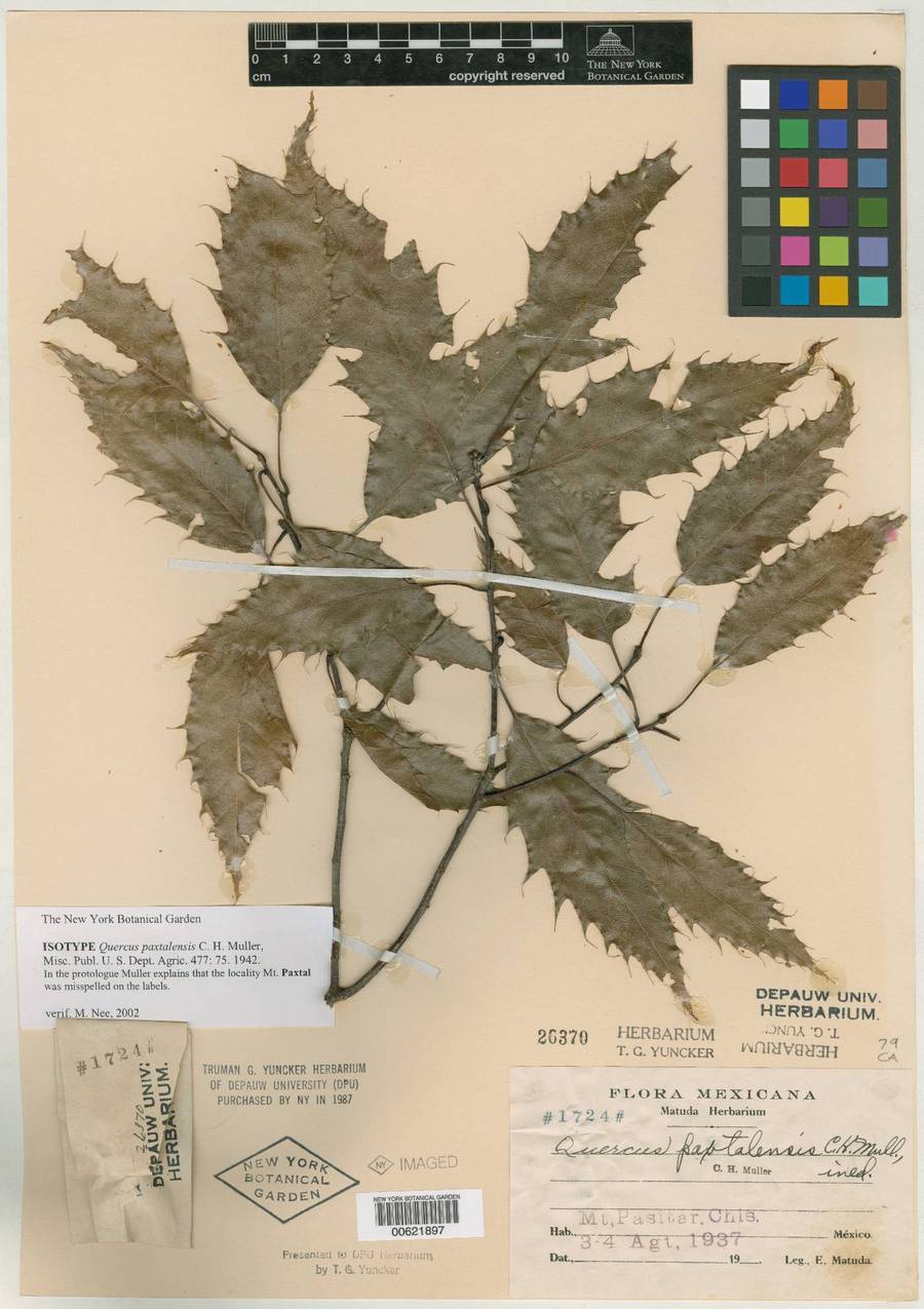 A. Camus : n° 399; -- Sub-genus Quercus, section Lobatae, Series Erythromexicanae, Group Acutifoliae; -- -- Possible confusion with Q. sartorii which has leaves only slightly shiny obove, and the teeth located in the distal half or 2/3 of the blade. -- Differs from Q. meavei which has acorns maturing in 2 years, more secondary veins (13-18) impressed above. |