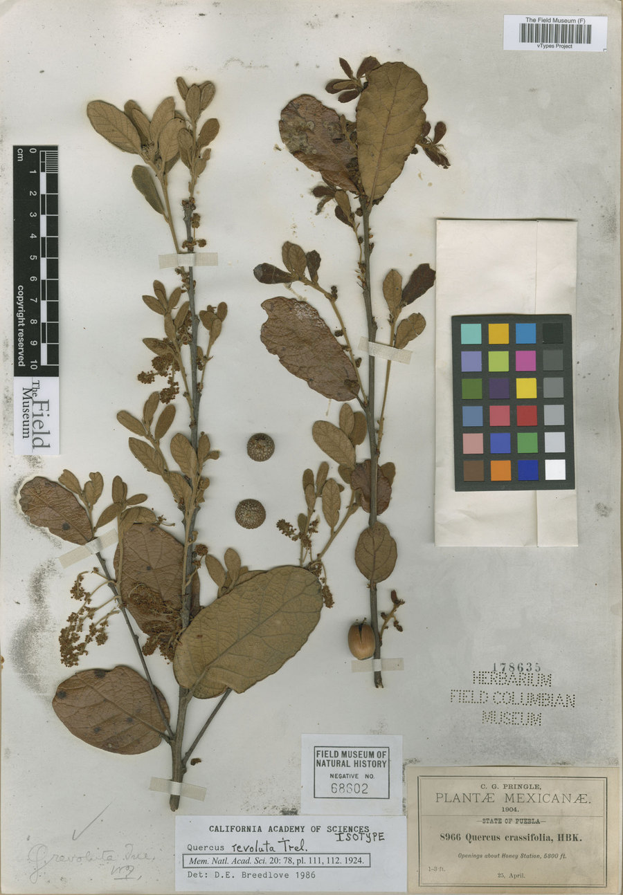 n° 249 ; -- Sub-genus Quercus, Section Quercus, Series Leucomexicanae -- For S. Valencia-A. 2004, as for Govaerts 2007, it is a synonym of Q. repanda Bonpl. |