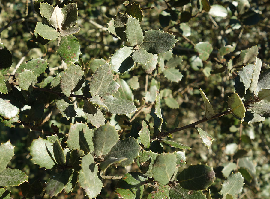 | Leaves | 1.5-4 cm, rounded on young trees, becoming oval and obtuse; margin sometimes pubescent and toothed (always toothed when young); ash-green or glaucous, slightly pubescent above; pubescent and whiter beneath than those of Q. ilex, with stellate trichomes (9-10 rays, 135-150 µm long); only 5-8 vein pairs, not evident beneath, at an angle of more than 45° with the midrib; midrib sinuous, mainly near apex; petiole 3-6 mm long; |