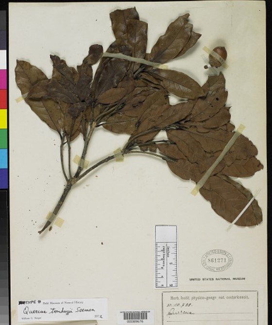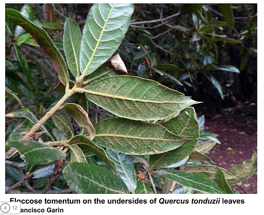 Diagnosis here = Q. seemannii var. or subsp. tonduzii (Seem.) A.E. Murray 1983 differs from Q. seemannii in having a floccose pubescence both sides of the young leaf, especially abaxially, soon deciduous; also the leaves are shorter (10 cm long maximum), the margin is wavy, and the angle between lateral veins and midrib is less open; unique range in Costa Rica, on the slopes of the Poas volcano; this taxon is very close to Q. seemannii (identical ??); Burger (1977) considers Q. seemannii as a complex, regarding its great variability, which includes probably Q. tonduzii and Q.gulielmitreleasei. |
