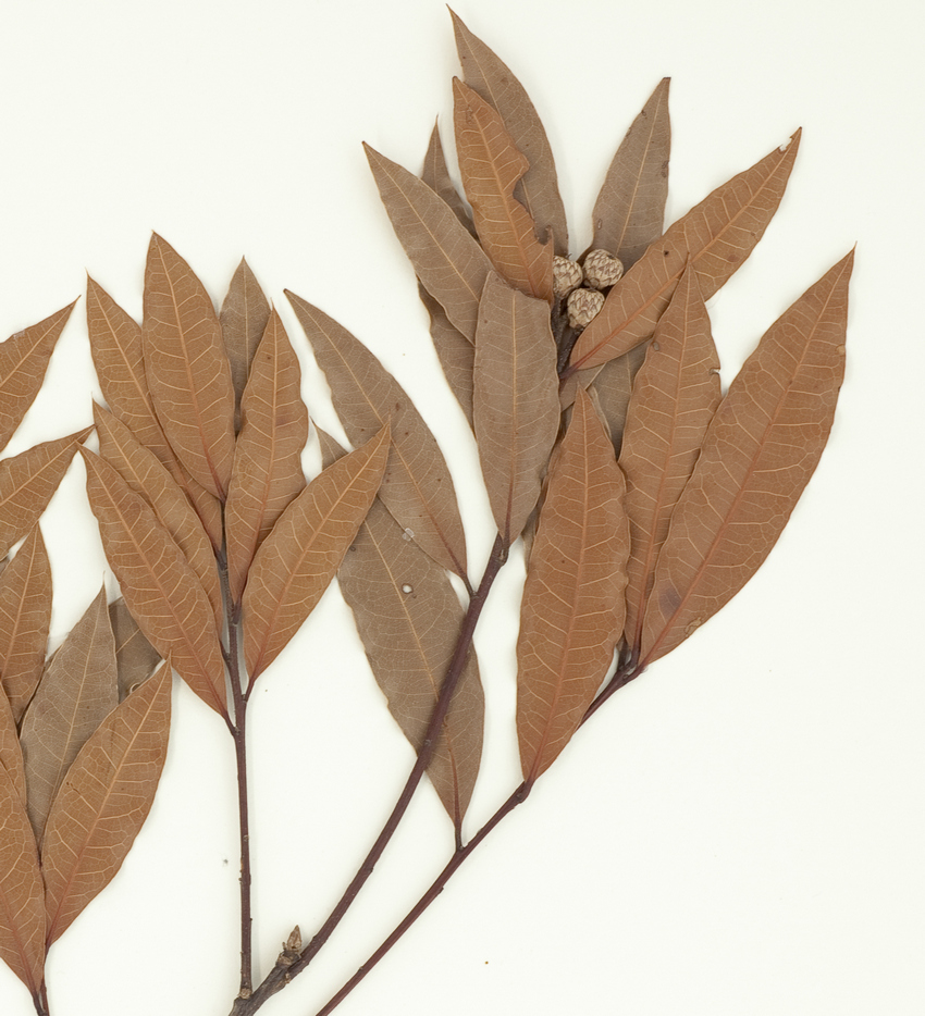Leaves | 6-10 (-15) cm x 1.5-3.5 cm; 5 to 6 times longer than wide; leathery; lanceolate to narrowly elliptical; apex acuminate, aristate; base cuneate or attenuate, seldom rounded; margin revolute, minutely crispate, entire; adaxially glossy, green without any shade of blue-green, hairless except sometimes a very scattered stellate pubescence at base of midrib; abaxially hairless except sometimes some stellate trichomes at base; 12-15 vein pairs, smooth or remotely raised above, prominent beneath, at an angle of 70-80° with the midrib, and connected each other before reaching the margin; petiole 2-6 mm long, glabrescent. |