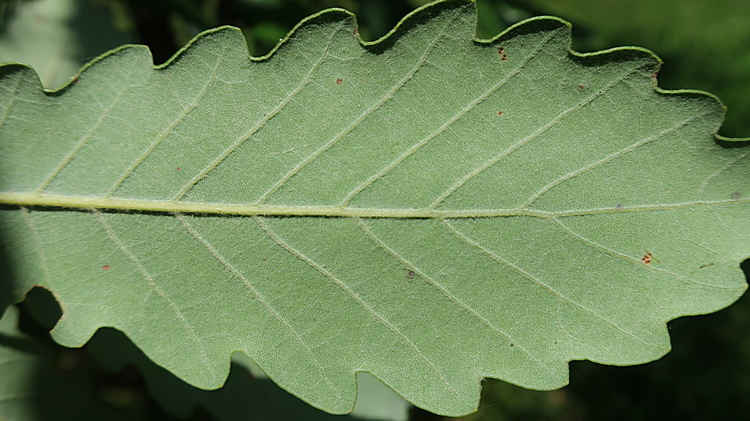 4-8 cm x 2-4.5; subevergreen; more or less leathery; oval-oblong or subelliptical; flat; apex rounded; base slightly attenuate, rounded or cordate; adaxially pubescent; abaxially whitish tomentose (stellate trichomes with 200-250 microns long rays, slightly curved; margin dentate (often almost crenate), sometimes with mucro; 8-12 vein pairs, slightly sinuous as for the midvein near apex; no (or very few) tertiary veins; petiole half-cylindrical, 5-14 mm long; |