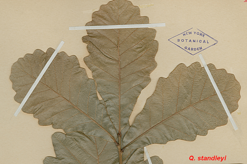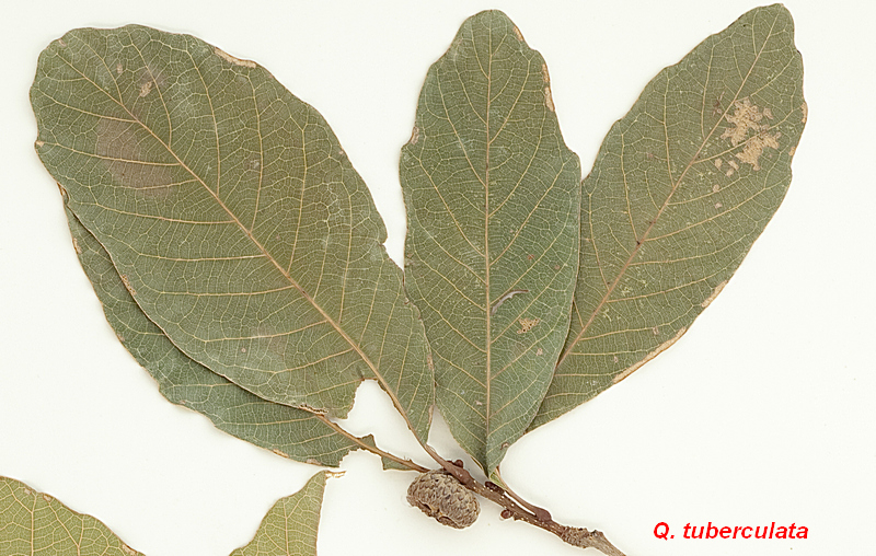 A. Camus : n° 197; -- Sub-genus Quercus, Section Quercus, Series Leucomexicanae; -- Related to Q.glabrescens, which it may be confused with, but Q. glabrescens has 2 cm long male catkins, leaves with shorter petiole and a margin with 3-5 pairs of teeth in the distal half, young twigs thinner, the peduncle of the acorn to 3 cm ; |