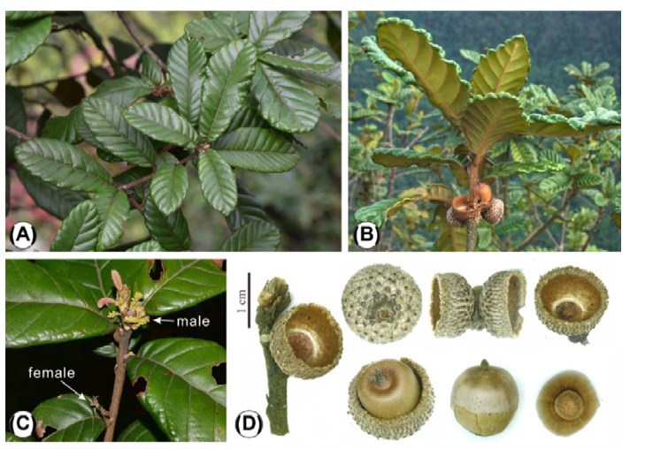 1.6-2 cm, ovoid to elliptic, glabrous; cup 11-15 mm in diameter, covering ca 1/3-1/2 of nut; scales flat, ovate-lanceolate to lanceolate; seed scar flat or slightly convex; maturation biennal in October-November; |